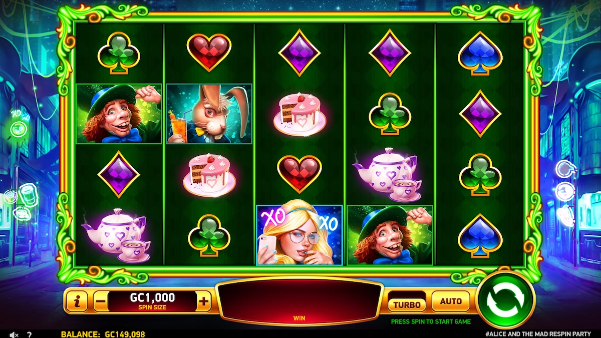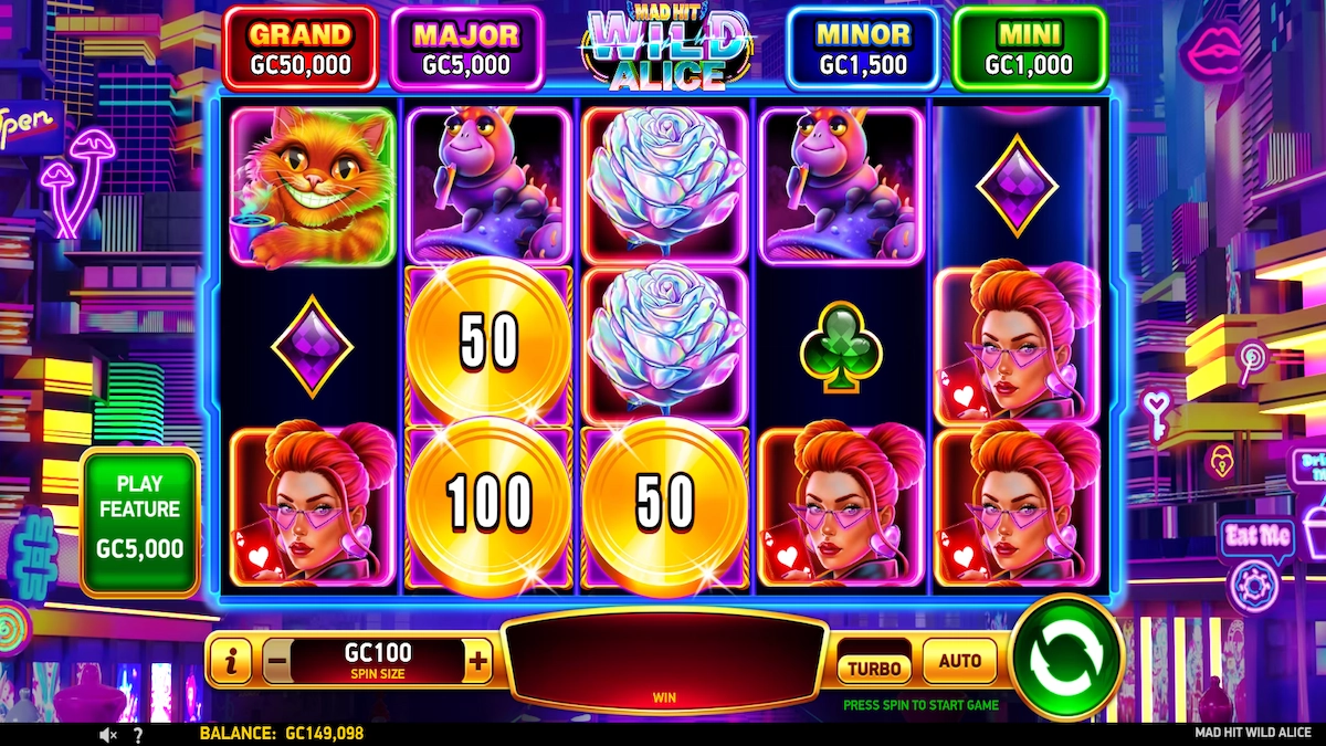 Ruby Play’s Mad Hit Wild Alice sets the classic story in a neon-lit cityscape. This medium volatility slot has a 5-reel grid with 243 ways to line up symbols. Four jackpot boxes sit above the reels, with the largest delivering major rewards. The Mad Hit symbol triggers fun effects: paired with a wild symbol, it expands across the reel; and paired with a golden coin, it activates a multiplier, free spins, or jackpot possibilities. Follow the symbols and see where the magic leads.