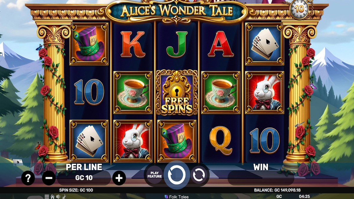 Spinomenal’s Alice’s Wonder Tale brings Wonderland to life on a 5-reel, 10-line grid, framed by golden columns and a hovering chessboard. Collect stamp symbols to activate Free Spins and gather coin symbols with Alice to add extra spins. A maximum win of 2,000x is possible, while whimsical visuals and coin symbols create a playful and entertaining adventure.