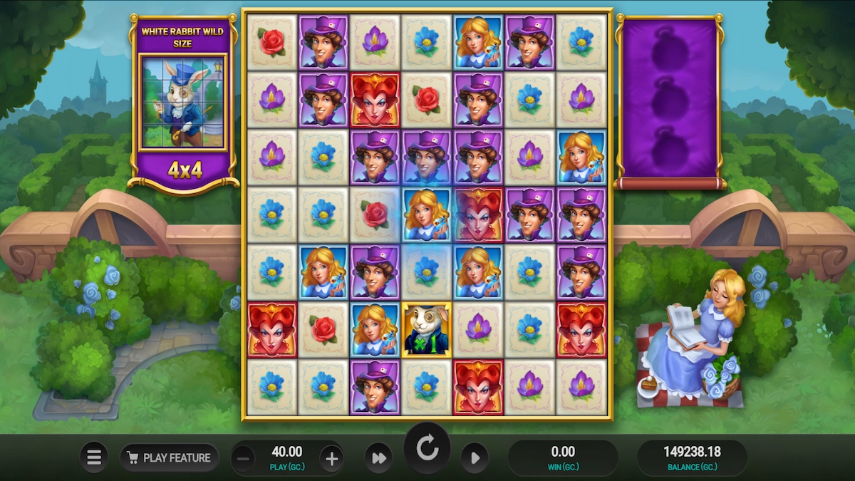 Relax Gaming’s Plunderland takes place on a 7-reel slot grid with cluster wins. Iconic characters like the Mad Hatter and Queen of Hearts appear on the reels, while the White Rabbit Wild moves to a “hotspot” after each cluster, expanding for extra symbols. Three scatters trigger six Free Spins, enhancing Wilds and multipliers for even bigger surprises in this Wonderland-inspired game.