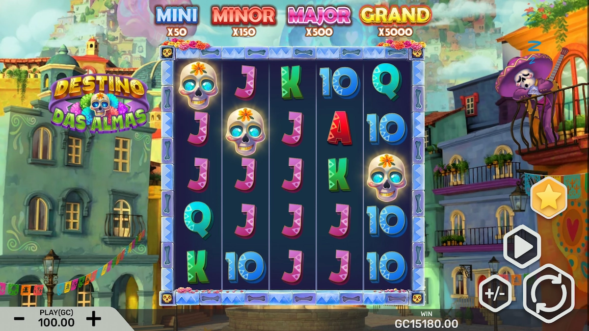 Grab a margarita and join the Día de los Muertos celebration on this 5-reel slot! Destino Das Almas is all about boosting your chances with special symbols. Look out for the fated wild which can shower the reels with up to 24 extra wilds for massive wins. The main event is the Bingo Bonus, triggered by scatters, which kicks off a respin round where you try to complete 12 different Bingo lines to win prizes and jackpots up to 5,000x your spin amount!