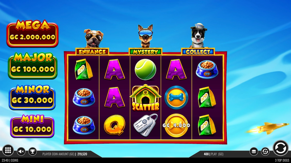 Deploy the elite K-9 operatives in 3 Top Dogs, a dog slot machine from Reel Riot. This high-volatility dog slot game features a team of specialists – Baxter, Ronnie, and Mobi – who are ready to fetch massive rewards on every spin. The hold and win mode is triggered by landing six or more coin symbols, awarding three respins.