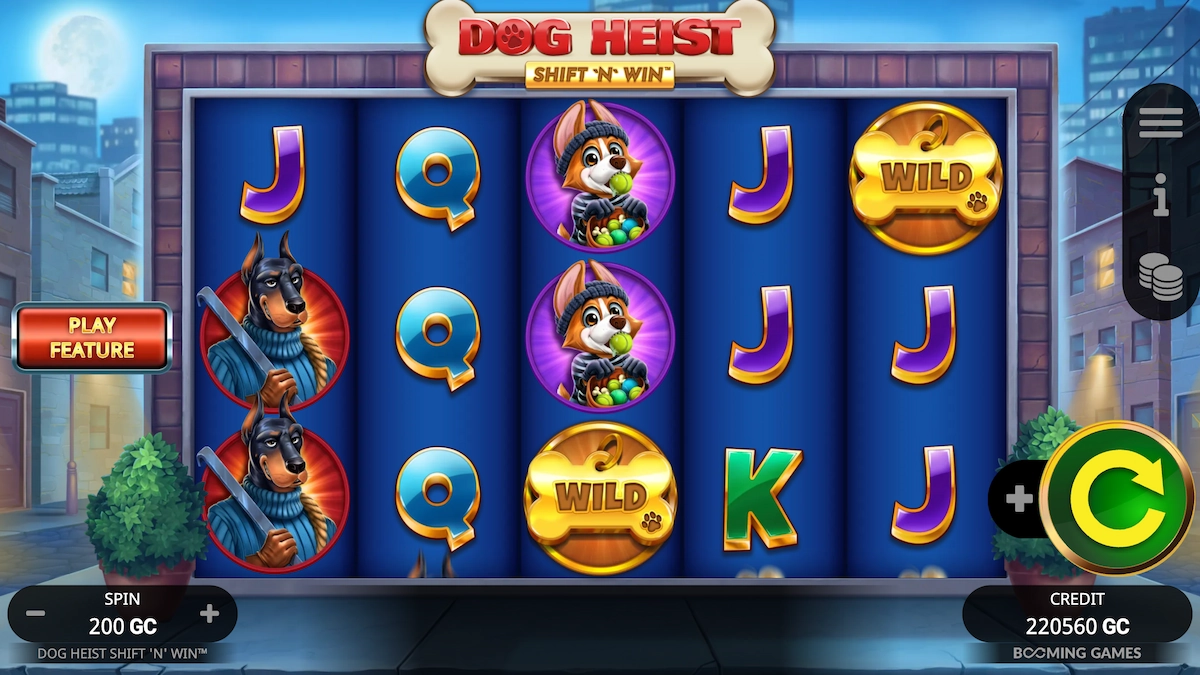 A gruff Doberman and his crew are ready for a gritty city heist in Dog Heist Shift ‘N Win, an action-packed dog slot machine by Booming Games. This highly volatile dog slot game has 5 reels and 10 winlines. The gameplay is centered on the Shift ‘N Win mechanic and the value collect feature, where multicolored vans gather multipliers up to 20x.