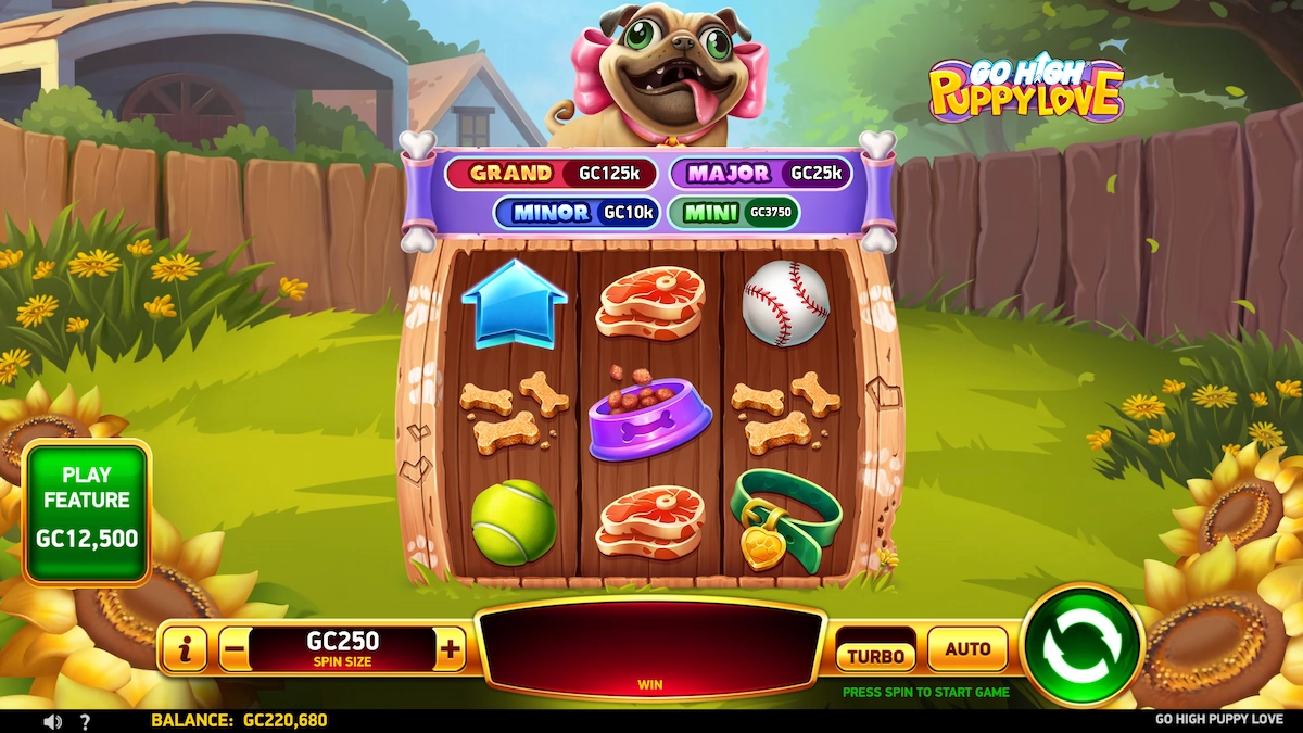 Fall in love with the adorable Go High Puppy Love slot, a cheerful dog slot game from Ruby Play with a charming pug in a bowtie. This low volatility slot game is perfect for players who enjoy a sunny garden setting, offering a compact 3-reel grid with five winlines.