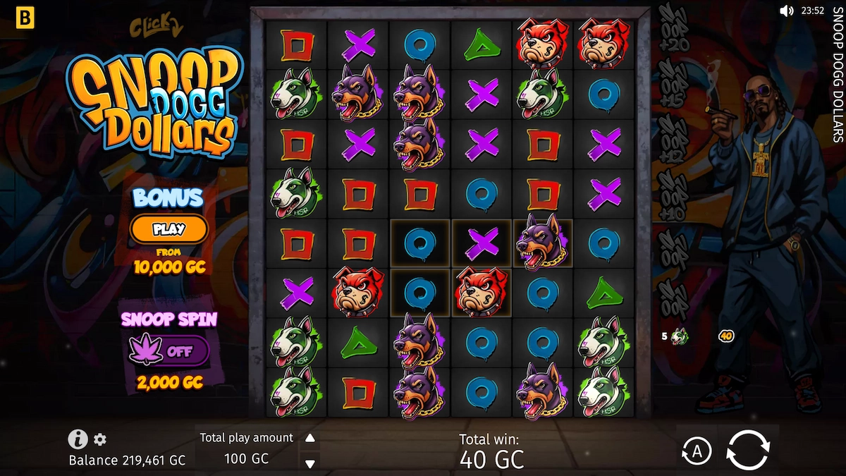Roll with the top dog of the West Coast in the Snoop Dogg Dollars slot, a high-volatility dog slot machine that takes you straight to the streets of Long Beach. This six-reel, eight-row grid stands out among dog slot games by using a cluster wins mechanic where winning symbols explode to trigger cascades and progressive multipliers up to 10x.
