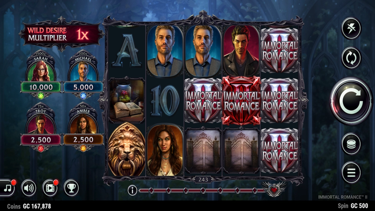 The vampires are back in this high-voltage sequel played on 243 Ways that upgrades everything fans loved! The core action is non-stop thanks to Rolling Reels being active on every spin. You’ll work toward the Jackpots Wheel via a gem collection mechanic, which can also trigger the game’s ultimate feature: the Wild Desire!