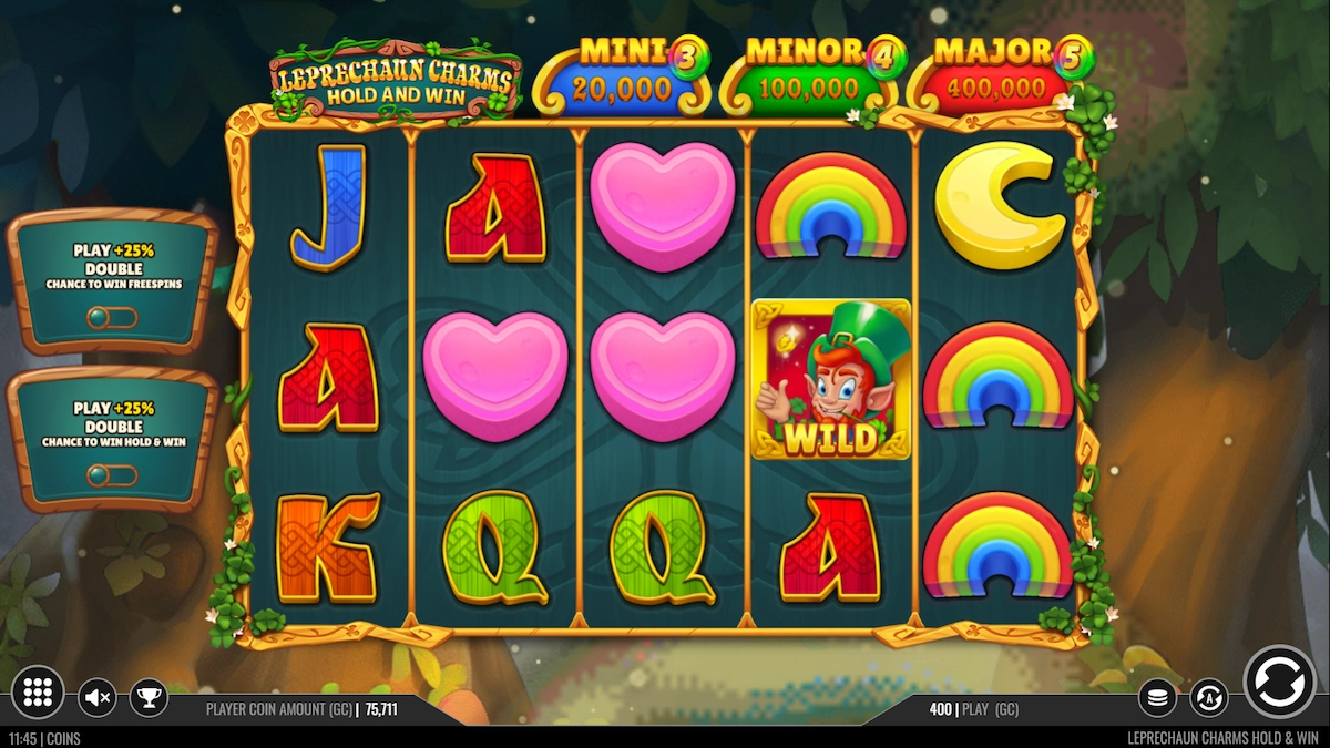Venture into an enchanted forest in Leprechaun Charms Hold and Win. Sticky coins, free spins, and a rewarding Hold and Win bonus keep the action lively. With its glowing visuals and Irish tunes, this leprechaun slot machine feels like a treasure hunt with every spin.