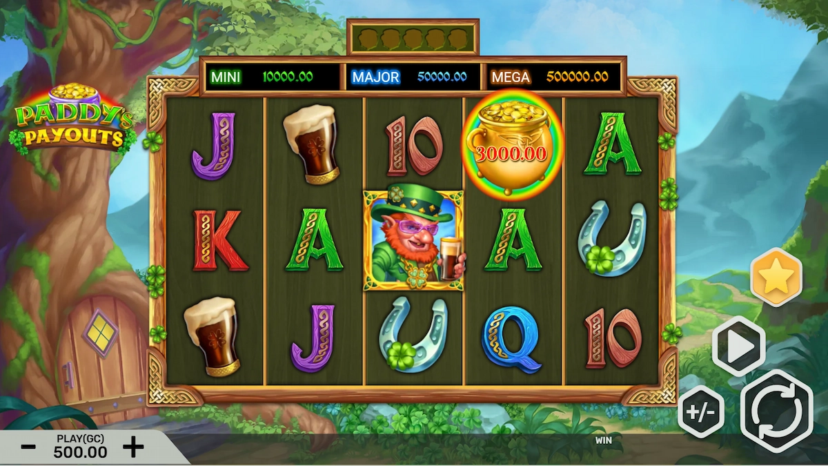 Paddy’s Payouts takes you to the Emerald Isle, where a leprechaun guards his golden hoard beneath a giant tree. Triple-value free spins and respins triggered by golden pots make this free leprechaun slot game a lively ride toward hidden treasure.