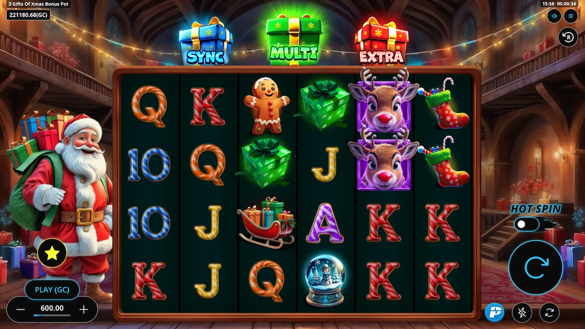 Depending on the gifts you unwrap, your bonus round can be transformed by powerful modifiers: the Extra gift doubles your starting spins to 16, the Multi gift applies a 3x multiplier to all wins, and the Sync gift mirrors symbols across up to four reels to help land those legendary prizes.