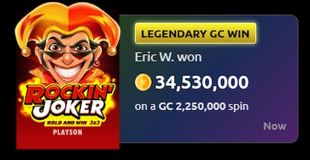 McLuck social casino turned up the volume with a massive win in Rockin’ Joker: Hold and Win! Player Eric W. hit a legendary 34,530,000 god coin reward on a GC 2,250,000 spin, proving that this Playson slot knows how to put on a show. With its rock-star joker, blazing reels, and Hold and Win features, this online slot game is all about creating headline-worthy moments.