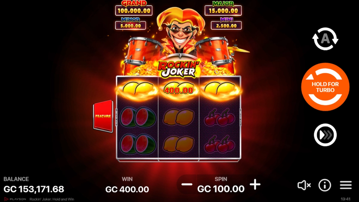 Rockin’ Joker: Hold and Win from Playson takes the joker into rock star mode, drumming across three flaming reels with five winlines and wins up to 10,000x your spin. The Joker-themed slot keeps things simple with classic fruit symbols. Bonus features hit hard, from gold coins with multipliers and jackpots to music notes that collect their value, nudges that can unlock the Hold and Win game, and the surprise Pile of Gold mechanic. You can even jump straight into the action with the Play the Feature option!