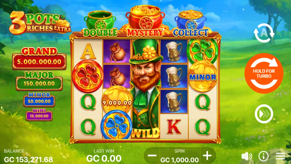3 Pots Riches Extra: Hold and Win from Playson takes the familiar leprechaun & pot-of-gold lore and turns it into a slot adventure where the grid expands and bonus magic cooks up surprises. When you hit enough coin symbols, you trigger the Hold & Win round. There’s a free spins feature to shake things up further and a top multiplier that gets as high as 5,000x.